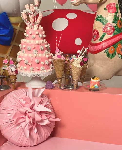 This is the Harajuku-inspired set dressing we provided for the shoot, but a creative decision to streamline was made on the day. I also sourced custom cupcakes and made several fake cakes as well as the cotton candy.